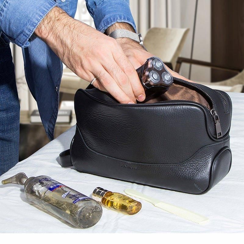 Denna Exceptionella Rakväska I Läder Är Gjord Av Koläder, Som Är Känt För Sina Hållbara Egenskaper, Den Perfekta Kombinationen För Resor. Insidan Av Väskan Är Säkert Fodrad Med Ett Speciellt Material Som Kan Hantera Oavsiktligt Necessärspill