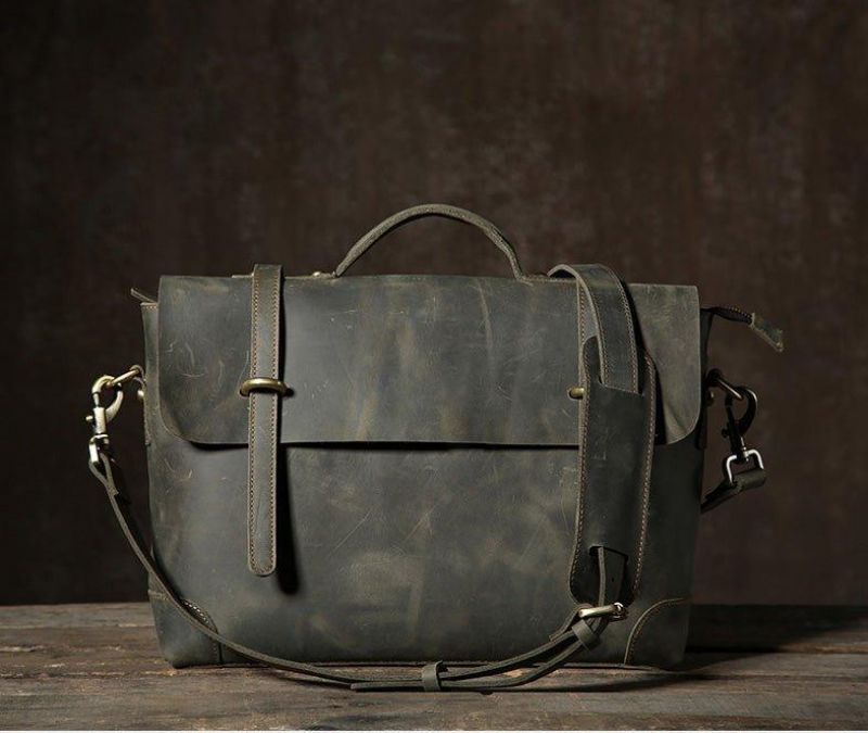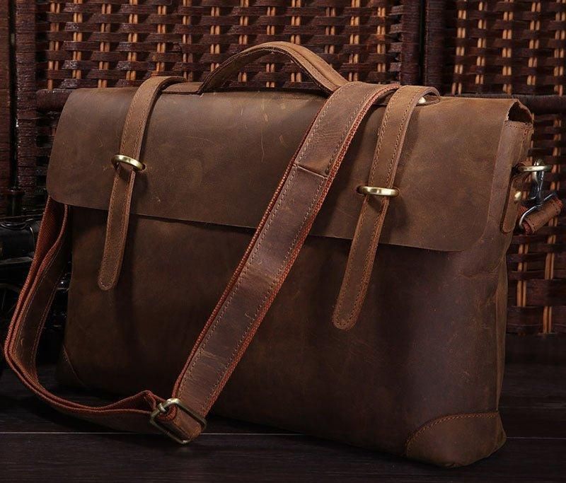 Denna Smala Vintage Portfölj För Män Är Gjord Av Crazy Horse Äkta Koläder På Översta Lager Med Hårdvara I Bronsfärg.